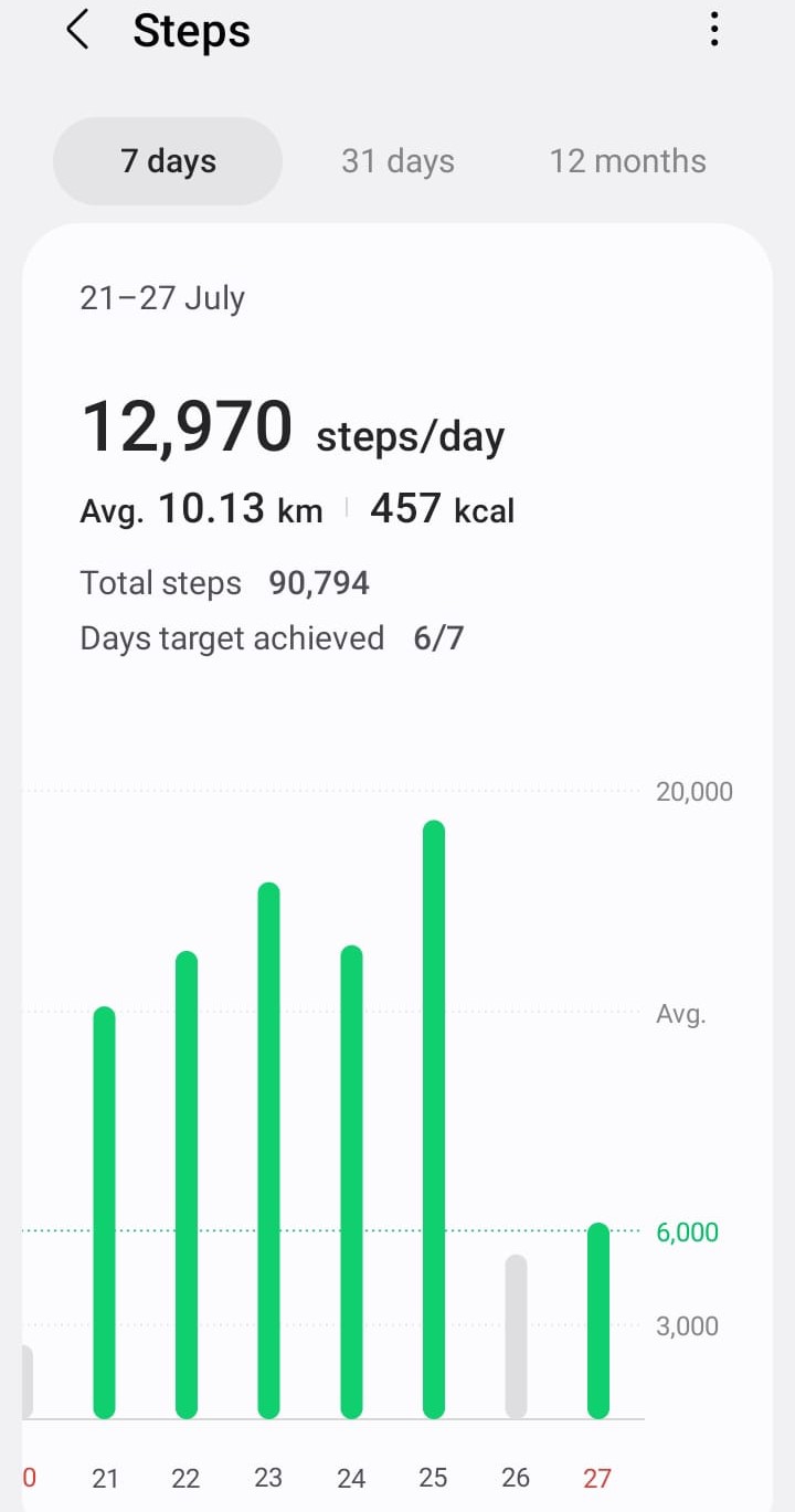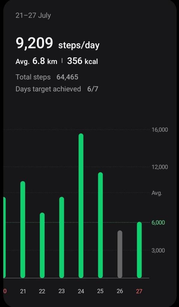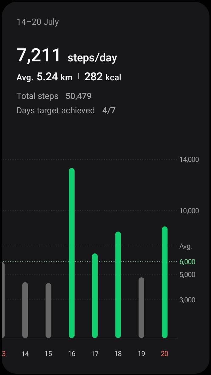 After my hospital visit in July, the doctor advised me to engage in minimal exercise and avoid straining myself. He told me to take it slowly and lift a top weight of 5 kg. As a result, I decided to use the Samsung Health app to gradually enhance my physical health. Initially, I set the daily step target at 9000, hoping to finish with ease. But after a few days and some excuses here and there, I brought it down to 6000 steps. This new target came with the possibility of having some feel-good moments.
